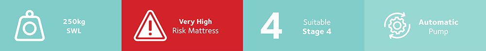 Cover for hygiene and reduced shear - The support surface has a removable and liquid-proof hygiene cover manufactured in a 4-way stretch material to reduce the risk of shear forces on the skin. Additionally, the cover is vapour permeable and has waterfall flaps designed with infection control in mind