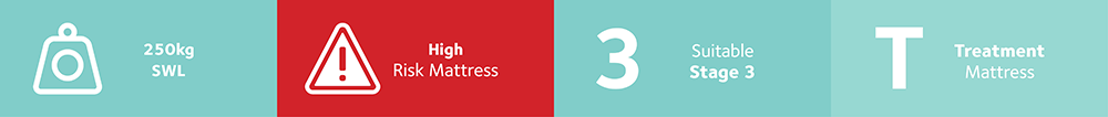 The mattress is divided into three zones, which, amongst other advantages, give better support when in the seated position. The pump, together with the mattress, is easy to use and very quiet. The 20-minute automatic timer embedded in the pumps max inflate function ensures safety surrounding immersion and envelopment principles when utilising this function for cares and transfers. Designed with an anti-shear inner cover and a soft, vapour-permeable outer cover, the Curocell SAM PRO mattress has very well-documented hygiene standards.