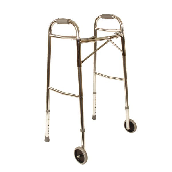This folding Walking Frame W/Front Fixed Wheels provides assistance for those who have difficulty walking. It folds in by pushing a simple release button. When folded this frame will fit into the smallest of cars and is ideal where storage is at a minimum. Other features are soft grip handles, simple push button height adjustment and anti rattle silencers.